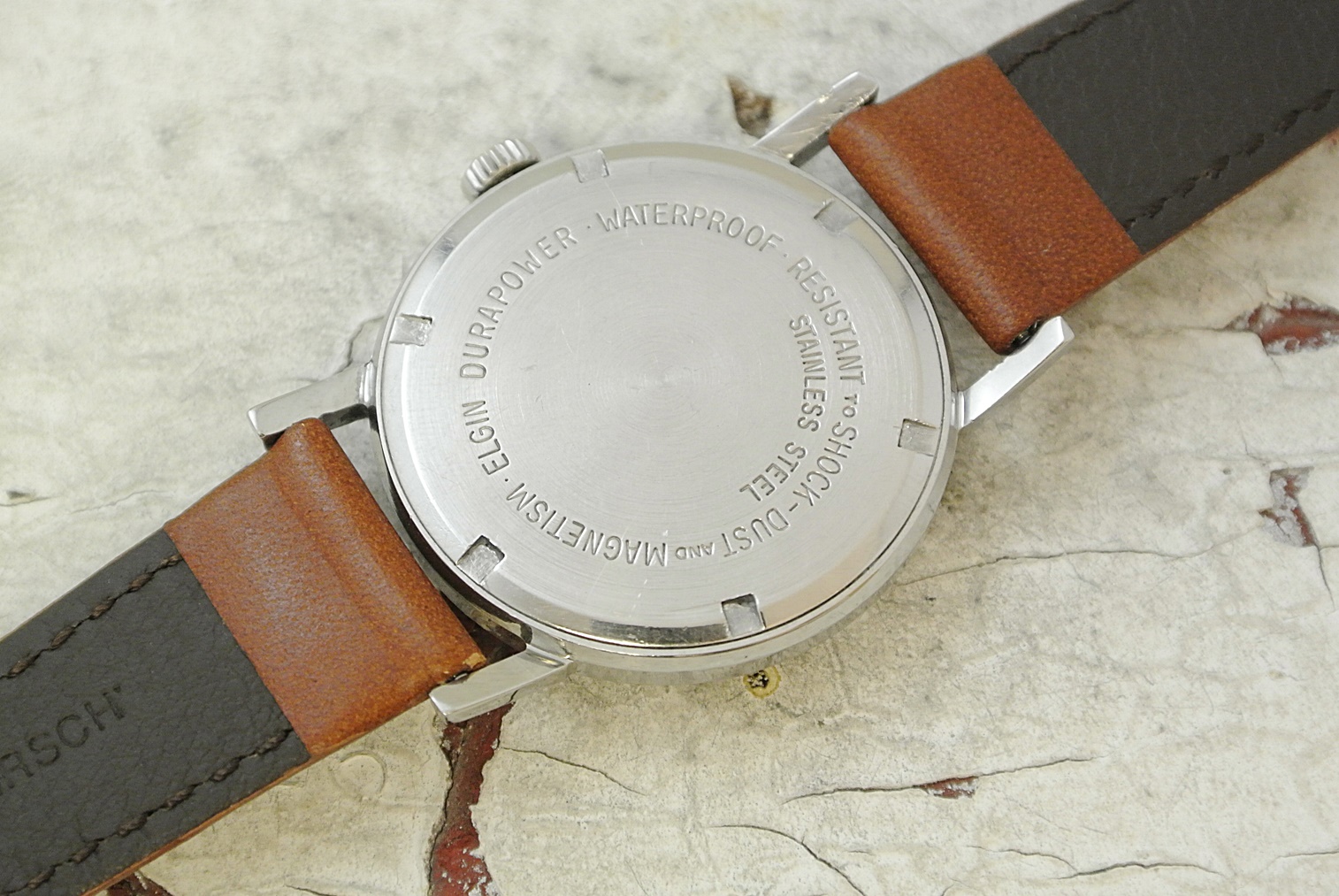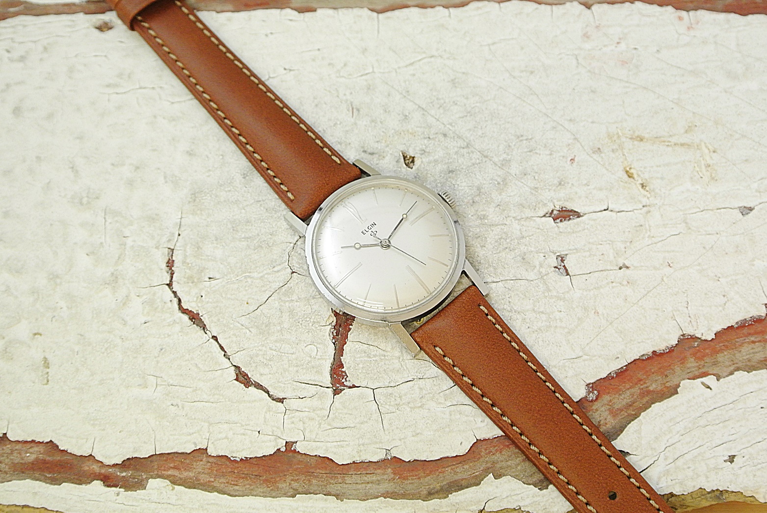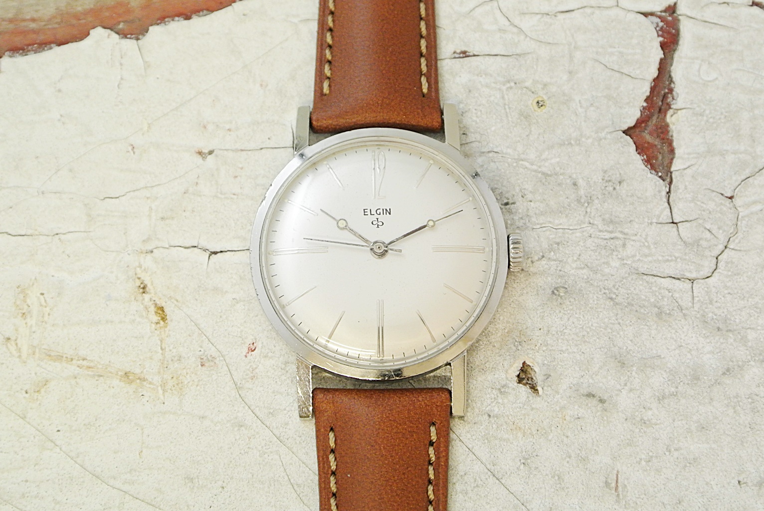- 針の形に特徴がある1960年代頃のアメリカブランド、”ELGIN(エルジン)”のビンテージウオッチです。ブレゲ針のような長短針の2/3くらいの位置にある丸い夜光が可愛らしく、秒針はインデックスの内周を沿うような長さになっています。柔らかく湾曲した文字盤はシルバーがかったホワイト色に細いバーインデックスのスッキリとしたデザインで、12時だけが細長いフォントのアラビア数字もどこかユニークで愛嬌のある雰囲気です。ムーブメントは当時存在したスイスのムーブメント製造メーカー、フォンテメロン社製の手巻式を搭載しています。資本が変わってしまった現在では高級時計のイメージはないエルジンですが、元々はムーブメントの製造まで手掛ける名門ブランドらしくエボーシュムーブメントもとても美しく仕上げられています。ベルトは明るめのゴールドブラン、L o’clock別注サイズの17mm・HIRSCH社製Kentを取り付けました。小ぶりで薄型のビンテージならではのサイズ感はユニセックスで着けらるのも嬉しいところです。