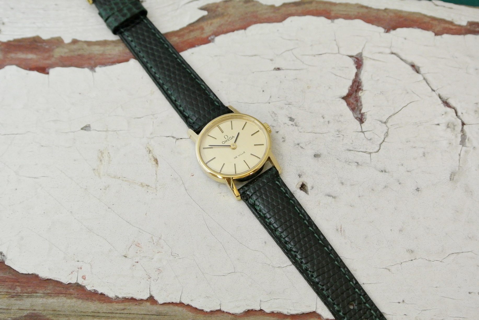 - 1970年代製、”OMEGA DE-VILLE(オメガ・デビル)”のレディースモデルです。レトロ感漂う横長のオーバルケースが可愛らしく、当時のレディースモデルとしては一回り大きめで普段使いにも嬉しいサイズ感です。派手になりがちなゴールド色のモデルでもフェイスデザインがシンプルなのでどんなスタイルにも合わせやすく仕事でもプライベートでも気軽に使えます。ベルトは艶やかで美しいHIRSCH社製Classic Lizardのグリーンを取り付けました。渋すぎずない独特の色味と艶がビンテージウオッチの持つ年代の味わいに現代的な魅力を加えてくれます。