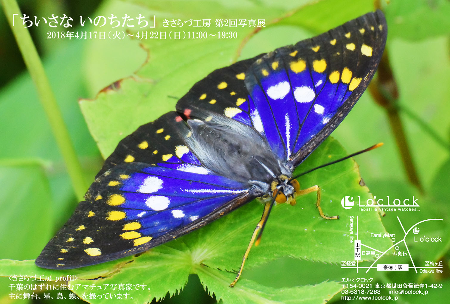きさらづ工房 第2回写真展 「ちいさな いのちたち」 おととしの7月に続き2回目となるきさらづ工房さんの写真展です。今回は「ちいさな いのちたち」と題し、美しい蝶の写真を展示いたします。 場所:エルオクロック店内 期間:2018年4月17日(火)~4月22日(日) OPEN 11:00 – CLOSE 19:30(月曜定休日) 作品展示:きさらづ工房 画像では伝わらない繊細な美しさをこだわりのプリント展示で是非お楽しみください。