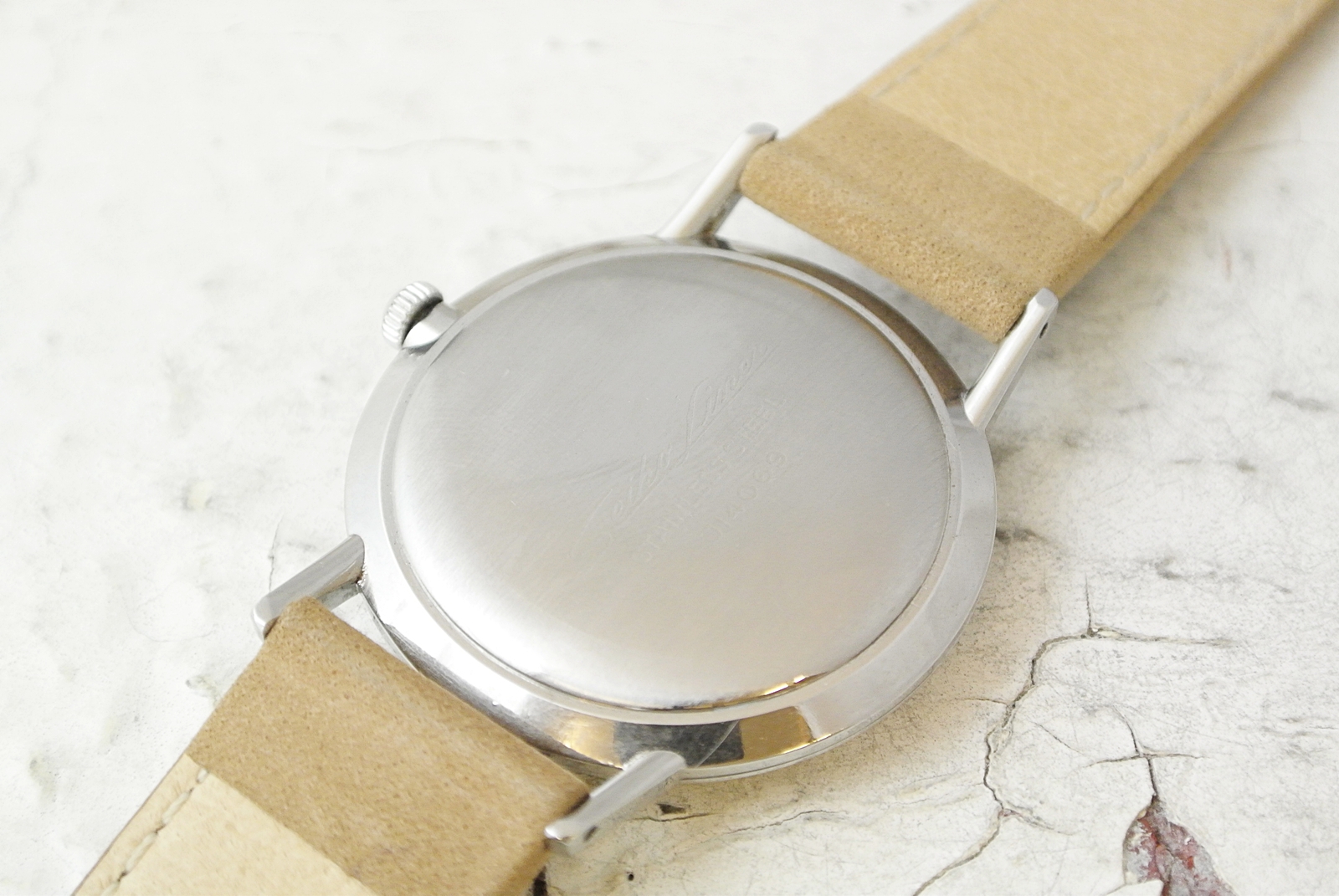 ■紳士用手巻き時計の薄型機として1960年代に販売された”SEIKO Liner(セイコー・ライナー)”です。60年代らしい線の細いケーススタイルにゴールド色の針と彫り込みタイプのインデックスが上品な雰囲気です。現行品のサイズ感で見ればレディースモデルと同じくらいで、女性にもおススメなモデルです。ベルトも少し女性らしいテイストに、HIRSCH社製Osirisのベージュ色を合わせてみました。インデックスのゴールド色との相性も良く元々はメンズモデルでもフェミニンに変身します。