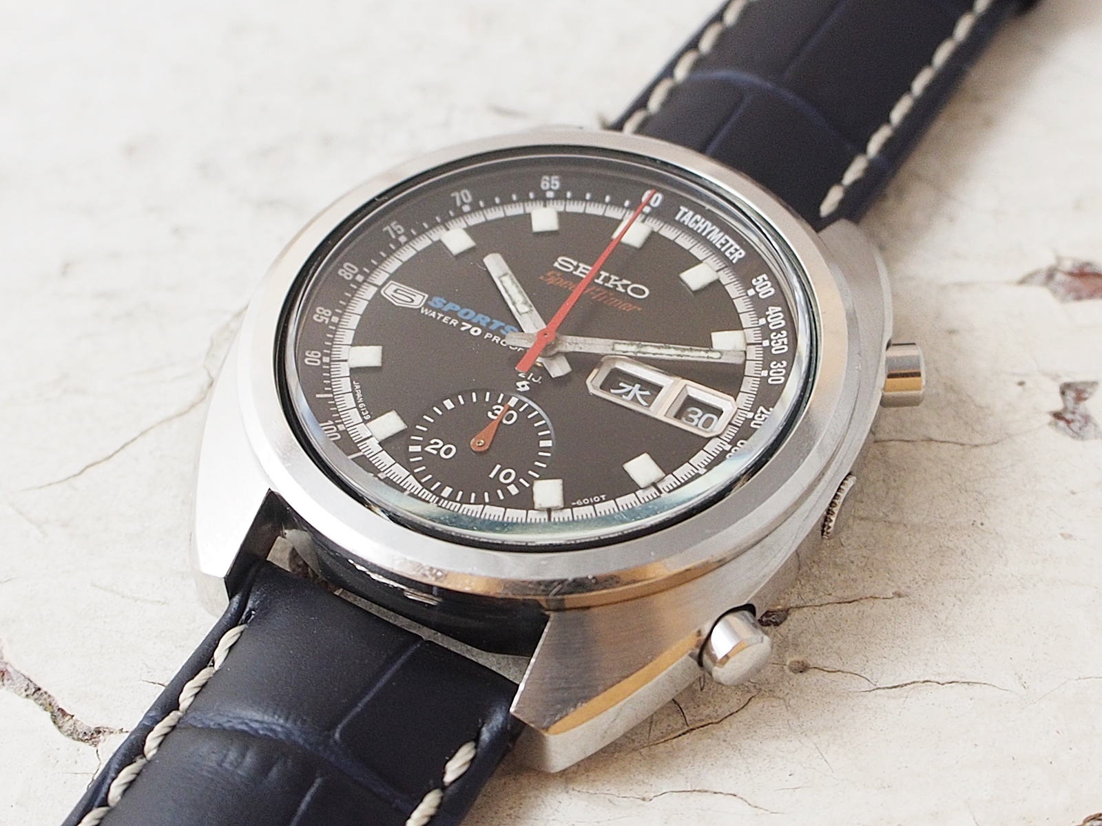 ■世界初の自動巻クロノグラフムーブメントのCal.6139を搭載した”SEIKO 5 Sports Speedtimer(セイコー・ファイブスポーツ・スピードタイマー)”です。センターの針はクロノグラフセコンドで6時位置には30分積算計を備え、日付と曜日表はリューズの押し込み操作でそれぞれの早送りが出来ます。タキメーターを記したインナーリングを備えた名前の通りスポーツ感あふれるデザインで、厚みのあるラージサイズやガラス素材の風防が採用されるなど新時代を感じさせる存在感のあるモデルです。ベルトはHIRSCH社製Modenaのネイビーを組み合わせ、カジュアルなスタイルにマッチする組み合わせにしています。