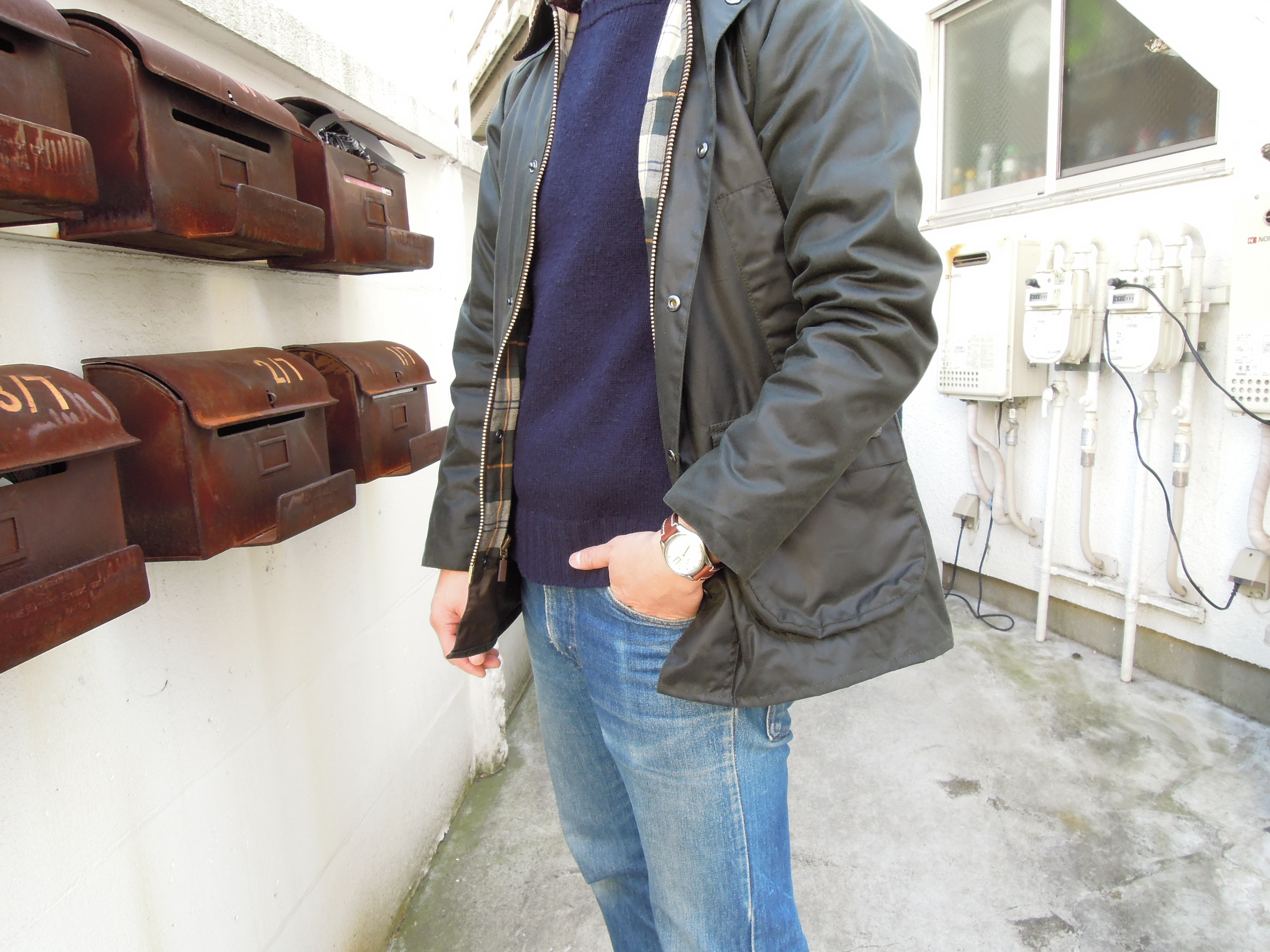 次はアウターをオイルドジャケットに。英国王室御用達のBarbour製で品のあるアウトドアスタイルが格好いいです。