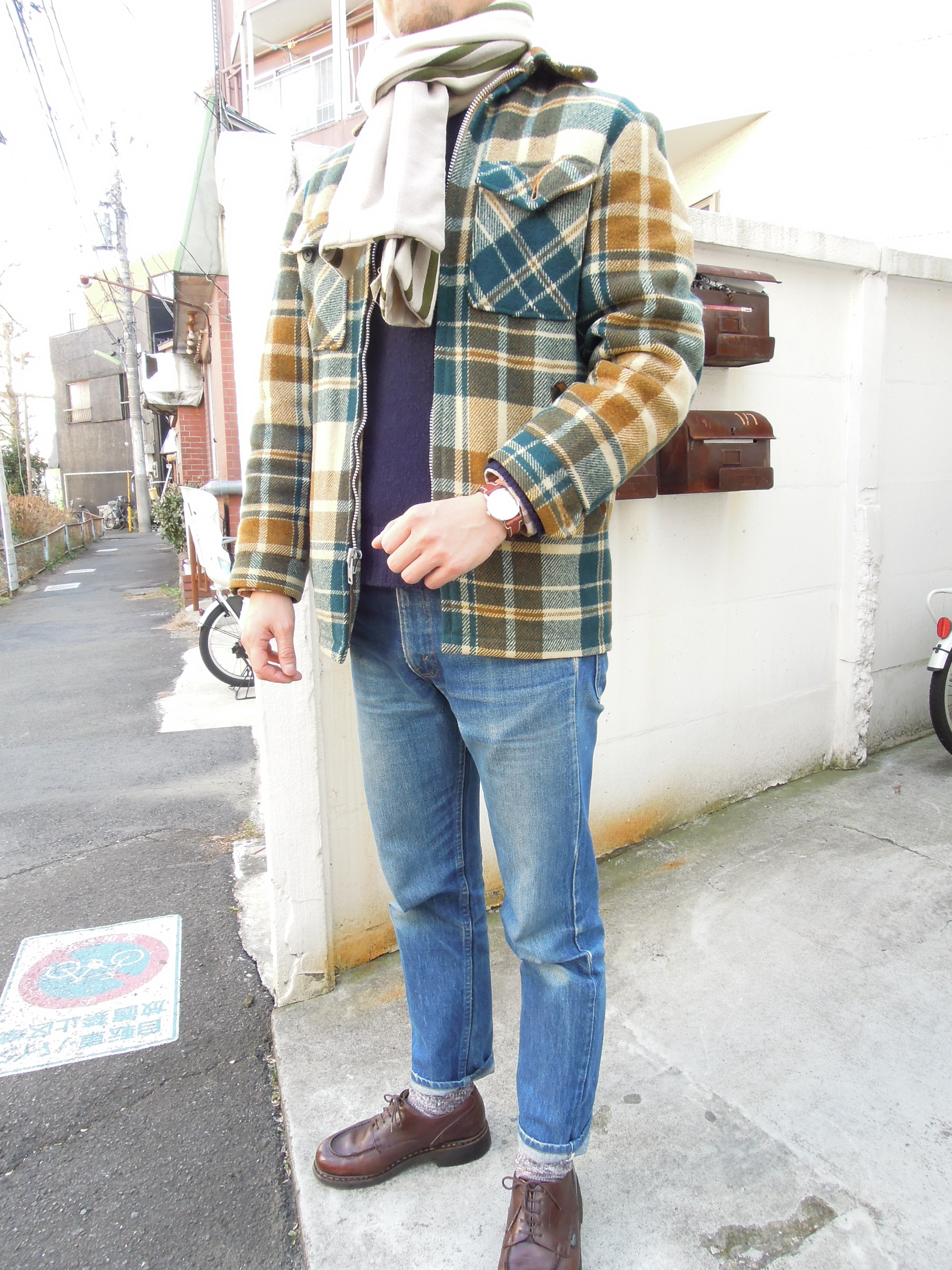 チェック柄が可愛いWoolrichのハンティングジャケットにデニムのパンツで大人の休日カジュアルなスタイル。