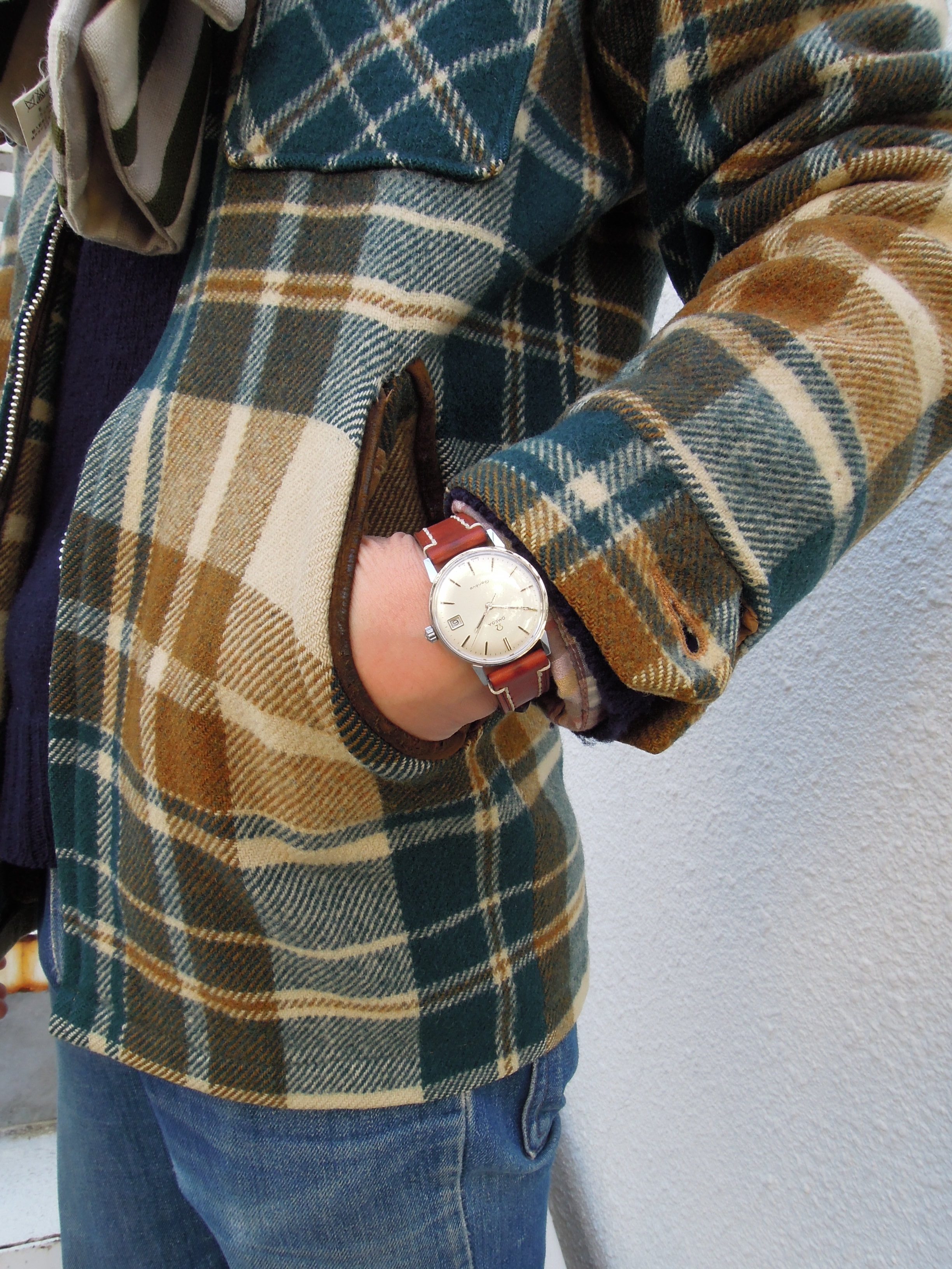 ちらっとのぞく腕元をシンプルな60年代OMEGAが飾ります。ベルトはビンテージウォッチと相性のよいオイルドレザーを使用したHIRSCH社製Libertyです。