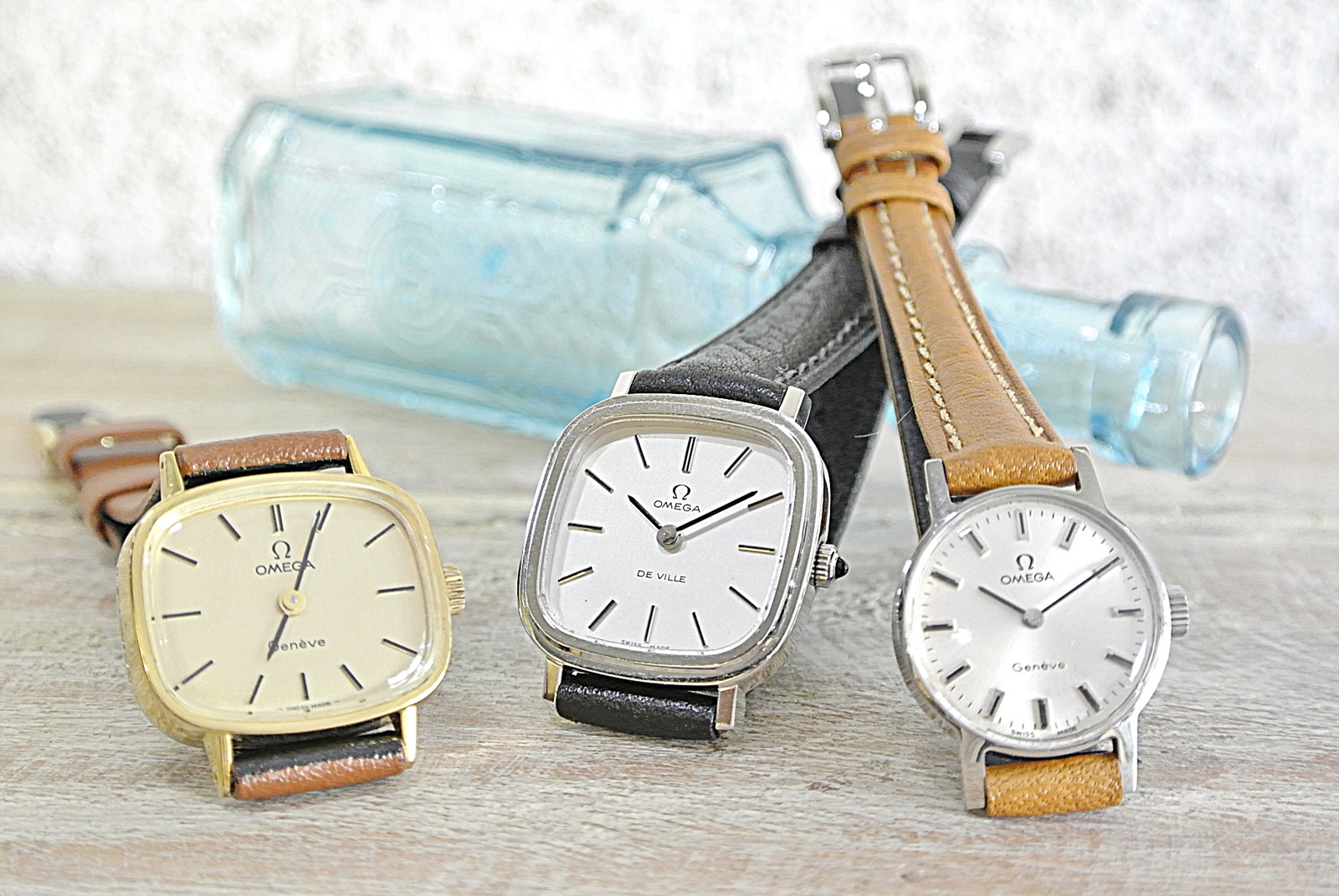 レディースモデルは手ごろな価格で気軽に普段使いが出来る1960~70年代製のシンプルなタイプを中心に。ベルトはカジュアルテイストのカーフブレスレット(すべてHIRSCH社製)を合わせました。